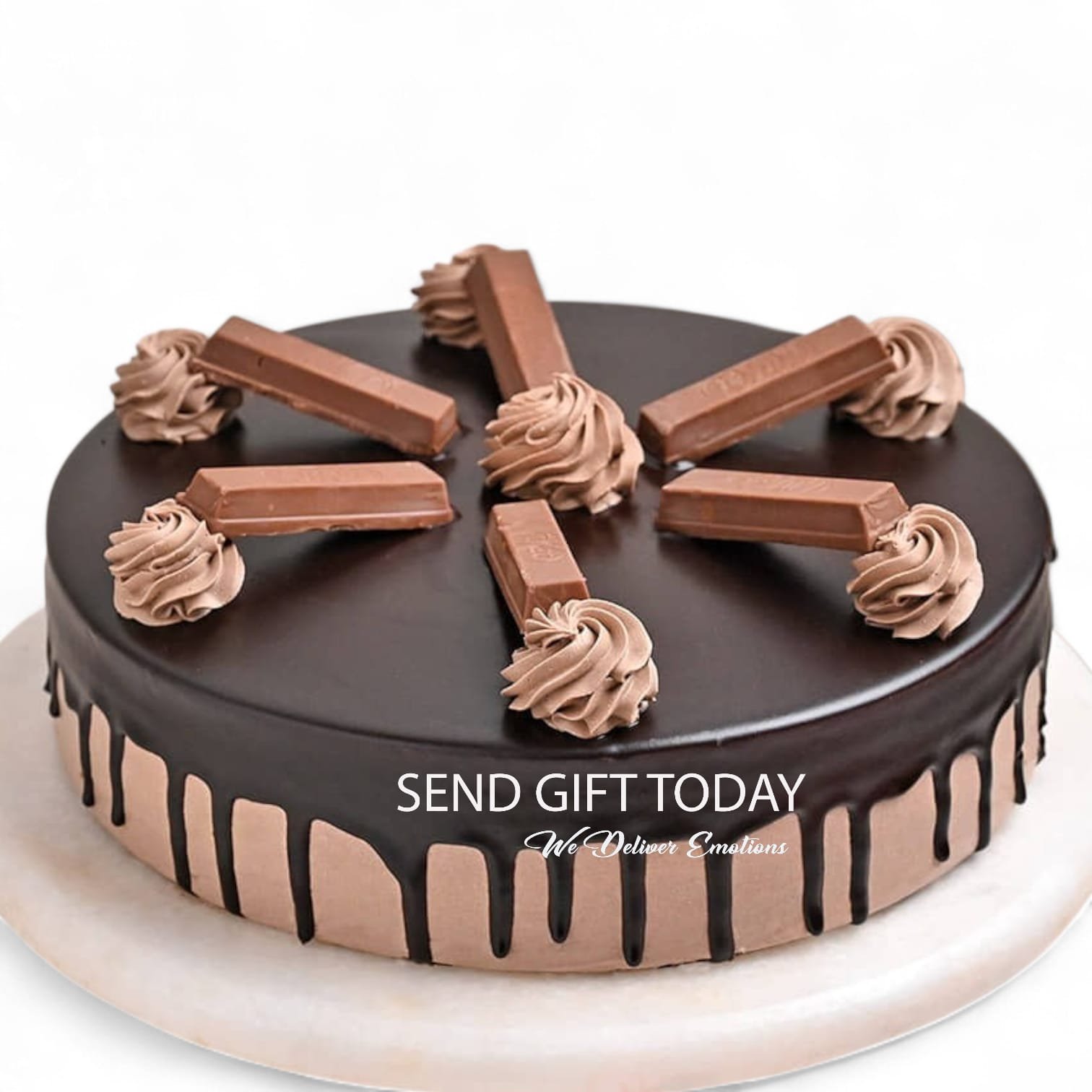 A moist chocolate cake layered with creamy frosting and wrapped in crispy KitKat chunks, topped with rich chocolate for a fun and indulgent treat.