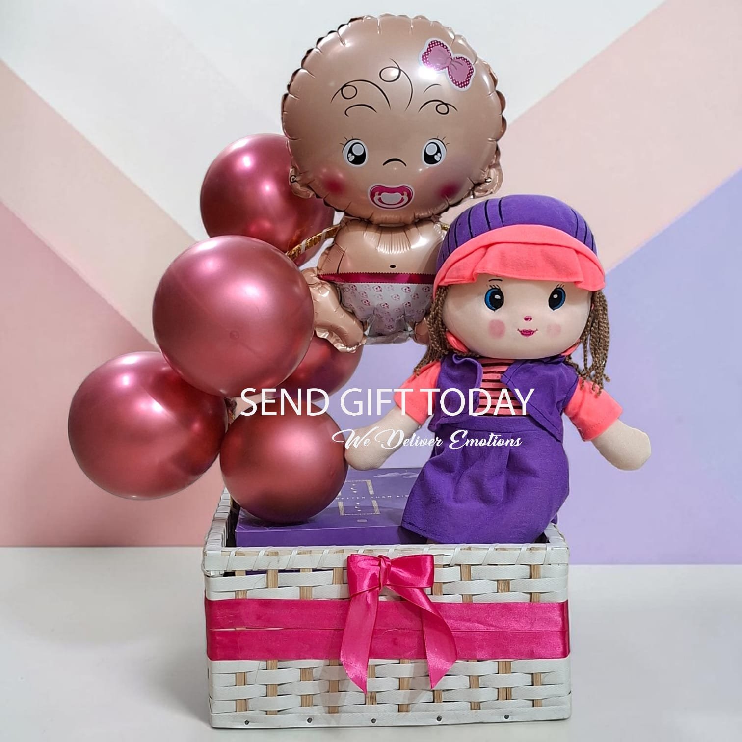 Celebrate the arrival of your little princess with this beautifully curated newborn celebration basket, featuring a premium cake styled with elegant balloons and a charming baby girl foil balloon. Paired with a super cute doll, it’s a heartwarming gift to welcome her with love, sweetness, and adorable charm.